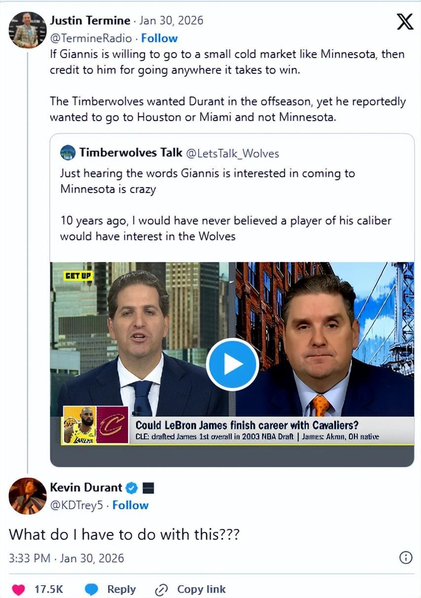随后NBA记者Termine转发该帖子,并配文道:“如果字母哥愿意去明尼苏达这样的小球市,那他为了夺冠愿意去任何地方的精神都值得称赞。森林狼休赛期曾想要杜兰特,但据说他只想去休斯顿或迈阿密,而不是明尼苏达。”